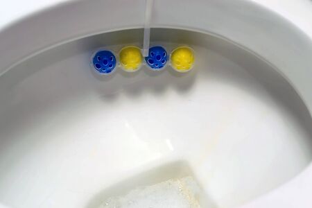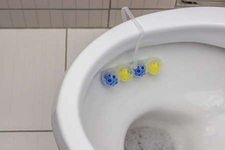 Clean toilet bowl with a cleaning and refreshing balls. Multi-colored balls of toilet bowl cleaner,