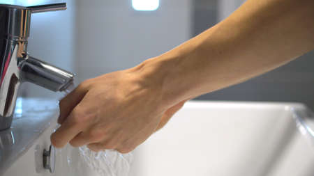 Coronavirus infection prevention. Person washing hands with soap and water, detail.