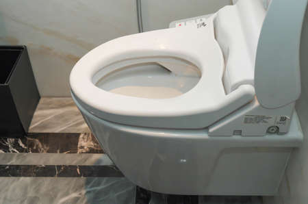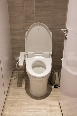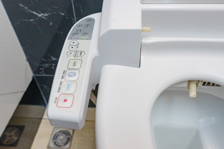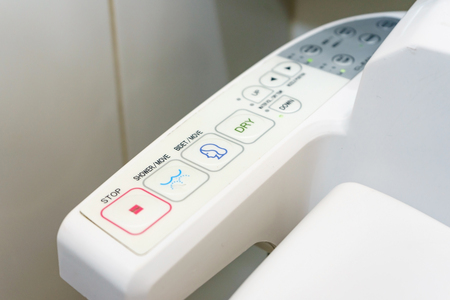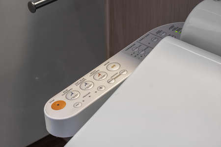 TOKYO, JAPAN - April 1, 2019: Modern high tech toilet with electronic bidet in Japan. Industry leaders recently agreed on signage standards for Japanese toilet bowls.