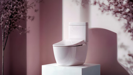 A sleek, white smart toilet with an integrated cabinet for storage and the back of its seat visible in a minimalist bathroom setting. The scene includes a wall-mounted sink on top of a floating shelf, all set against a clean background with large windows allowing natural light to illuminate the space. A small plant adds life to the composition. --chaos 30 --ar 16:9 --stylize 750 --v 6.1 Job ID: 088ffa9b-6174-4dda-acf5-a61acfbb2325