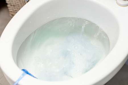 Water is pouring into a pristine toilet bowl in a modern bathroom setting showcasing cleanliness and functionality during installation.