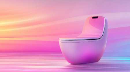 A futuristic toilet with a curved seat and lid in pink, purple and blue, AI