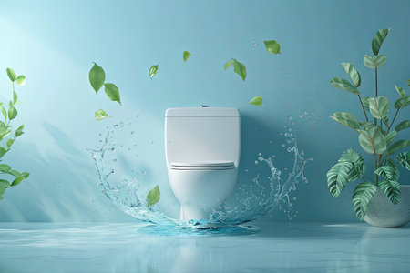 A white toilet sits in the center of a blue bathroom, with water splashing around its base, forming blue shapes and green leaves floating above its bowl. Green leaves are scattered throughout the image, adding a touch of nature to the space.
