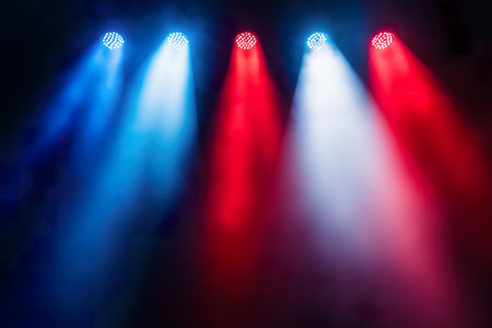 Colorful stage lights on a dark background. Abstract background of red and blue spotlights.