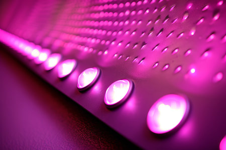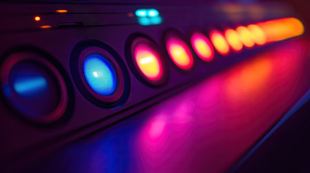 Detailed shot of a speaker's illuminated control panel with vibrant LED lights.