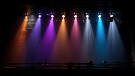 Bright and colorful stage lights create an enchanting backdrop in an empty theater, showcasing the potential for countless artistic performances and events.