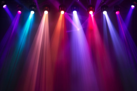Vibrant Stage Lights with Colorful Beams on Black Background