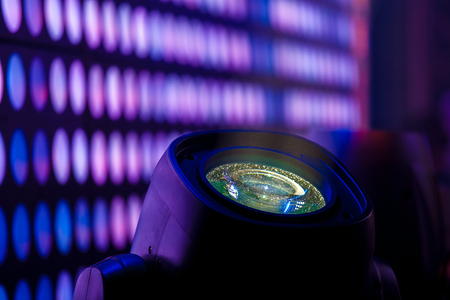 Stage spotlights rotating heads in neon lighting. horizontal photo