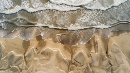 This captivating aerial photograph displays the beautiful merging of waves and sand along a pristine shoreline, showcasing stunning natural textures in tranquil colors.
