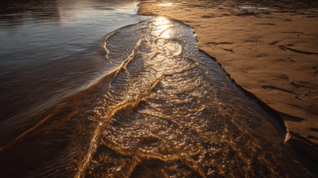 A serene view of a river gently flowing over golden sand with warm sunlight reflecting off the water, creating a tranquil evening scene.