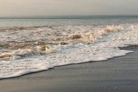 A captivating scene of foamy ocean waves gently rolling up onto a tranquil shoreline, highlighting the mesmerizing beauty of natures harmony. The serene horizon complements the soft interplay of
