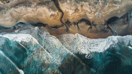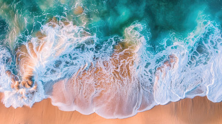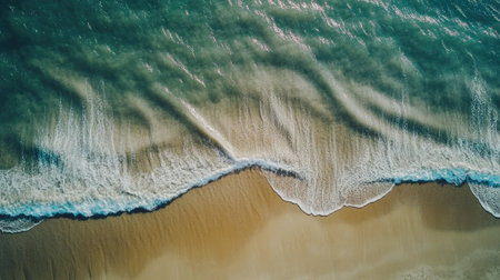 An aerial perspective of water waves crashing onto a sandy beach, showcasing a natural landscape with a stunning geological phenomenon in motion AIG50