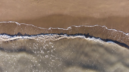 Aerial view of ocean waves breaking on sandy beach. Top view