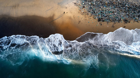 An top view of a polluted beach. Ocean waves bring garbage to the shore. The problem of ecology and pollution of nature and the planet.
