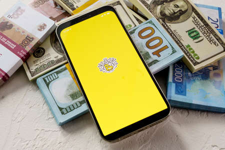 Sochi, Russia - October 1, 2021: iPhone 12 Pro with Tinkoff Bank application on the screen and dollar money