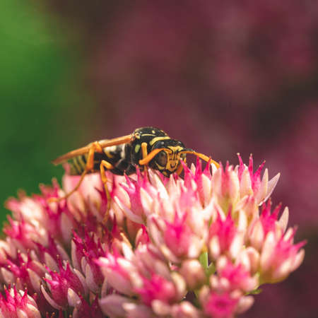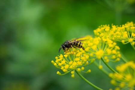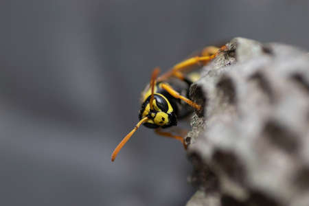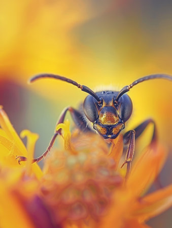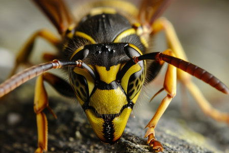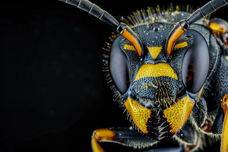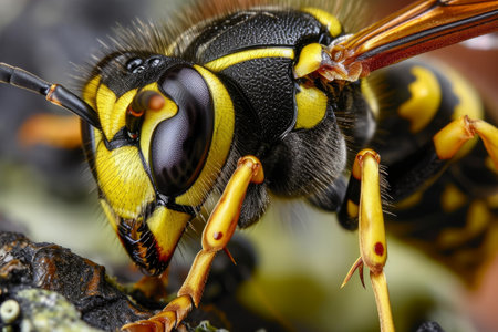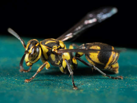 Closeup of yellow and black striped wasp in garden macro insect photography of nature s detail
