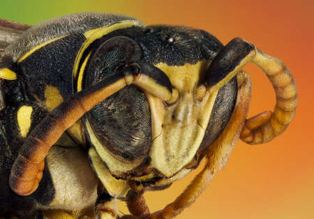 Extreme macro portrait of a wasp taken with two lenses as one lens, stacked from many shots into one very sharp photo.