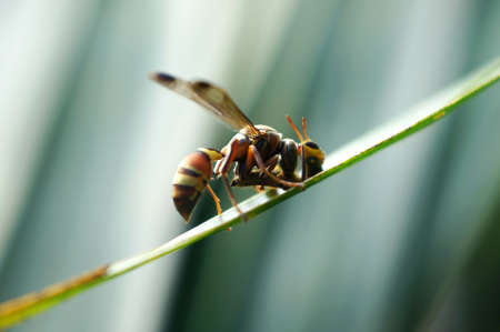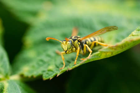 Front view of a yellow wasp, winged hymenopteran insect, over a green big leaf with nature background