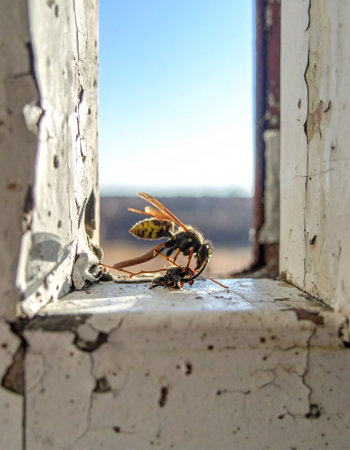 A solitary cuckoo wasp rests on a weathered windowsill, its metallic body catching the sunlight. Framed by peeling paint and decay, it gazes out at the vast blue sky, a poignant scene of a small creature on the threshold between a forgotten interior and the freedom of the outside world.