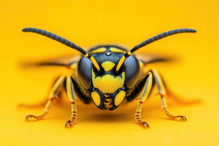 This wasp is captured in detail showing its striking yellow and black colors against a vibrant yellow backdrop. The insect appears focused.