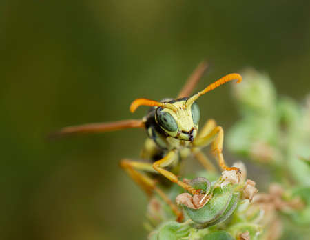 Extreme sharp and detailed study of wasp head on green background taken with microscope objective stacked from many shots into one photo