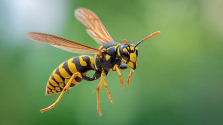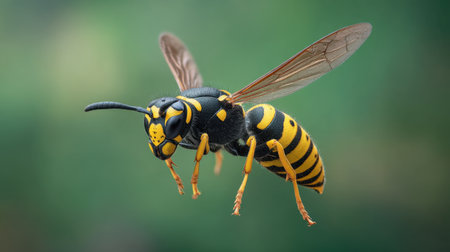 A detailed view of a wasp in mid-flight showcases its striking yellow and black coloration and elegant wing structure against a blurred green backdrop.
