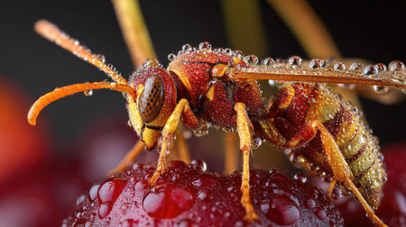 A macro shot shows a wasp perched on a deep red surface. The wasp's body displays vibrant red and yellow hues. Tiny water droplets glisten on the surface and the insect. The composition highlights details. The image may be suitable for illustrating insect life or natural science subjects. Ideal for commercial applications.
