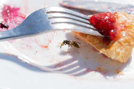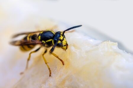 A Common wasp (vespula vulgaris) investment in the summer after warm winter, pest on the breakfast table eating food