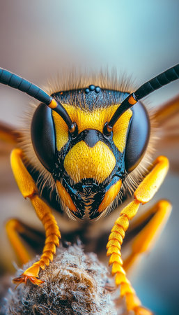 Highly detailed macro photograph of a wasp's face, symmetrical, front view, against a blue background, using macro photography techniques, photorealistic, with studio lighting, close-up, taken with a macro lens. --ar 13:10 --v 6.1 Job ID: f7178467-4efe-4121-8fda-1ebb4a52bfbd