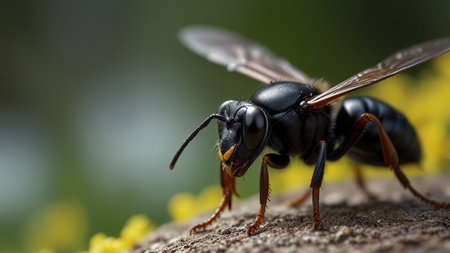 A vivid yellow and black wasp captured in mid-flight, highlighting the intricate details of its structure. This stunning macro image emphasizes nature's beauty and complexity.