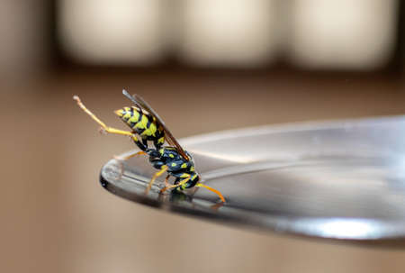 A wasp drinks water from a spoon by lifting its hind legs on a very hot summer day in a house.