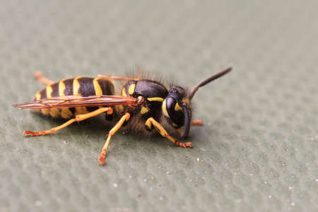 Macro dead wasp. Dead animal. Yellow insect closeup
