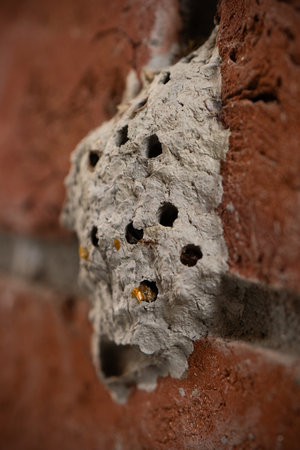 Wasp nest on a brick wall. Selective focus. Shallow DOF.