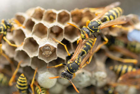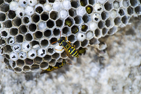 wasp nest with larvae, honeycomb wasp, closeup, natural background