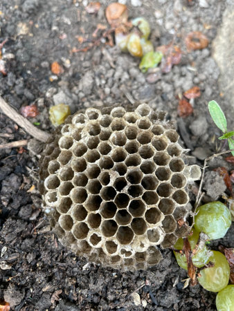 Empty Wasp Nest on Ground with Grapes Nature and Garden Scene