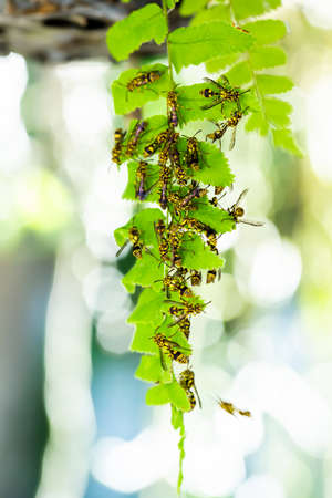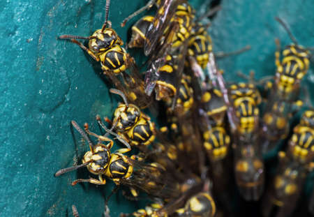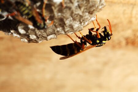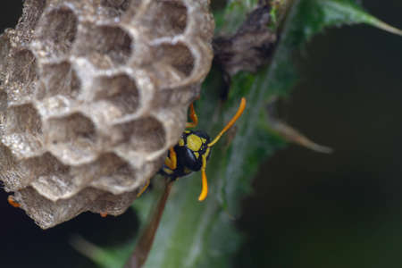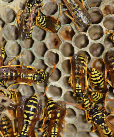 Wasps polist. Wasp nest with wasps sitting on it. The nest of a family of wasps which is taken a close-up.