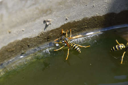 Wasps drink water from the pan, swim on the surface of the water, do not sink.