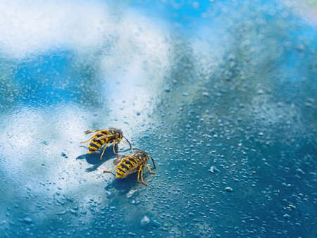 Macro dead wasp. Dead animal. Yellow insect closeup