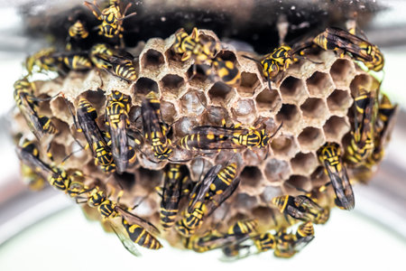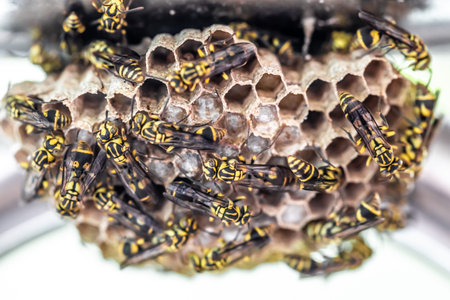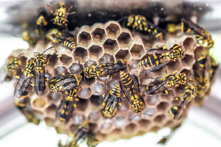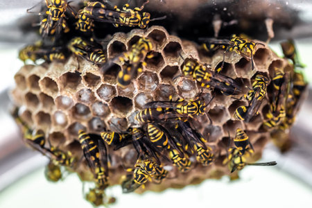 Wasp nest with larvae. Concept- danger, allergic reaction to a wasp sting.Selective focus.