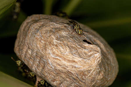 European Polistes galicus wasp hornet taking care of his nest and larvae