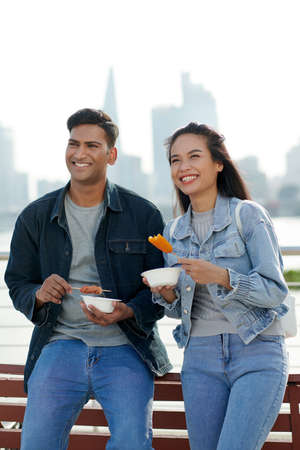 Happy young couple standing on bridge, enjoying city vide and eating tasty street food