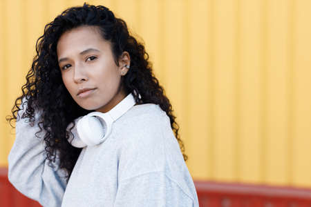 Beautiful happy dark skinned african american ethnicity woman in yellow tshirt while looking in camera with pleasant smile, posing against gray green studio wall background