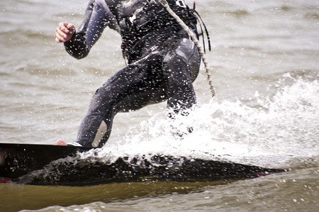 Water snowboard. The athlete with snowboard hold on to the rope and the boat accelerates.