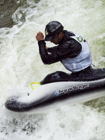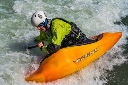 Augsburg, Germany - June 16, 2019: Whitewater kayaking, extreme kayaking. A guy in a kayak sails on the Eiskanal in Augsburg Germany