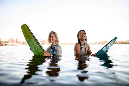 view of women in swimsuits stands in the river water with surfboards