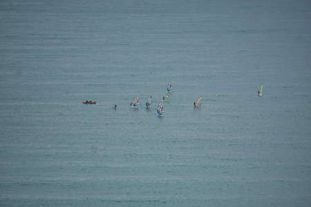 windsurfing in the Mediterranean sea in the city of Alicante, in the Valencian Community, Spain. view