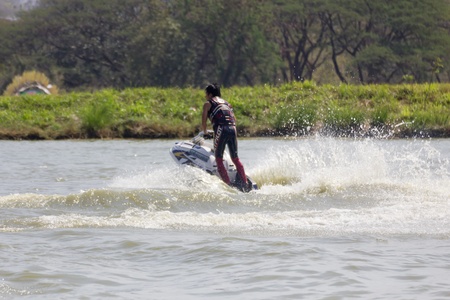 SARABURI THAILAND-JANUARY 20: Sonswut Rappasubpisan in action during show Freestyle the Jet ski stunt action on Jan 20, 2013 in SARABURI,Thailand.
