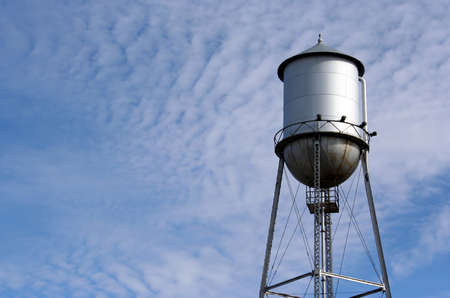 A water tower against a cloudy blue sky. Lots of space for copy.