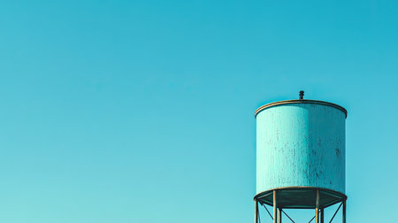 A striking image of an elevated water tank set against a clear blue sky, showcasing a minimalist aesthetic. The weathered surface captures the beauty of industrial design and environmental themes.