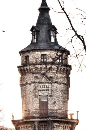 Abandoned gothic-style water tower in the gloomy city.